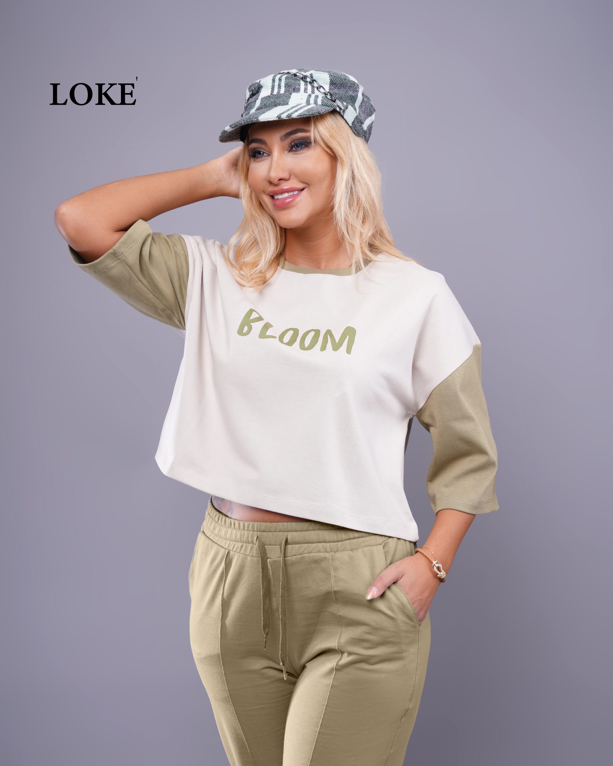تیشرت کراپ دو رنگ زمینه کرم آستین سبز زنانه